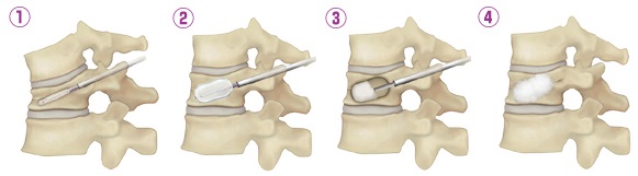 これも高齢者社会において増加傾向している疾患です。 骨粗鬆症のある方が、軽微な外傷により胸椎や腰椎の椎体骨折(時に病的骨折と言われます)を起こします。 従来は安静と疼痛コントロールという治療法が取られてきましたが、通常は1ヶ月を超える安静が必要でした。 しかし、このような骨折を引き起こされる方の多くは高齢者で、こういった方が1ヶ月程度の安静臥床を行うと、 その後にリハビリテーションを行っても元のような生活ができなくなり、介護度が上がるということがよく見られます。 こういったことから治癒の遷延が予想される症例に対して、骨折椎体にセメントを注入して疼痛コントロールが可能で、 早期離床が期待できるBKP(Balloon Kyphoplasty:風船を用いて骨セメントを注入する椎体形成術)という治療が行われるようになってきました。 (下図①~④)4週間程度の安静を行っても体動時の痛みが強く、日常生活が困難な症例に対して実施するのが原則でしたが、 超高齢者や他疾患による廃用が危惧される症例には比較的早期から本術式を行うになってきています。 手術には全身麻酔が必要ですが、実質1時間から1時間半程度の手術となります。