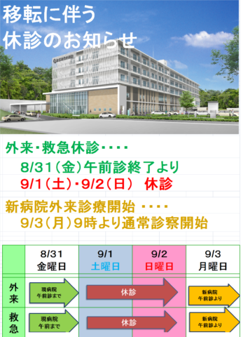 平成30年09月01日より新病院へ移転予定となっております。